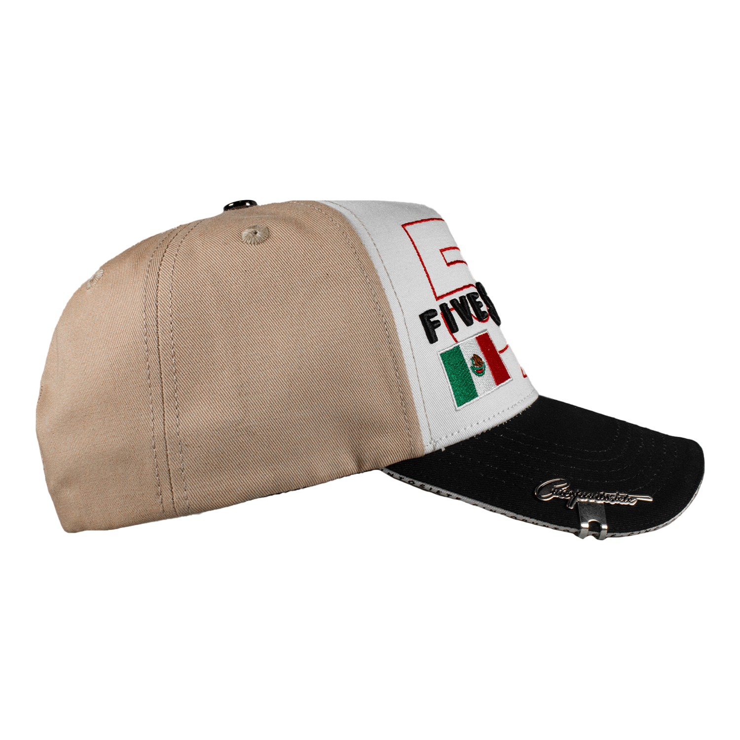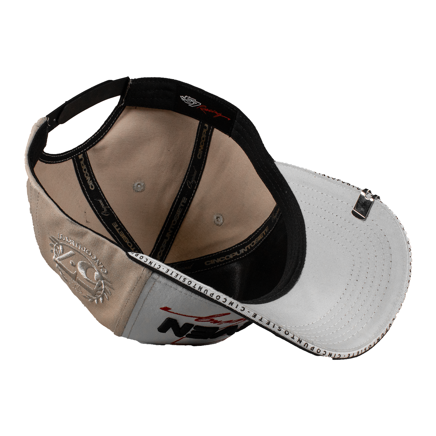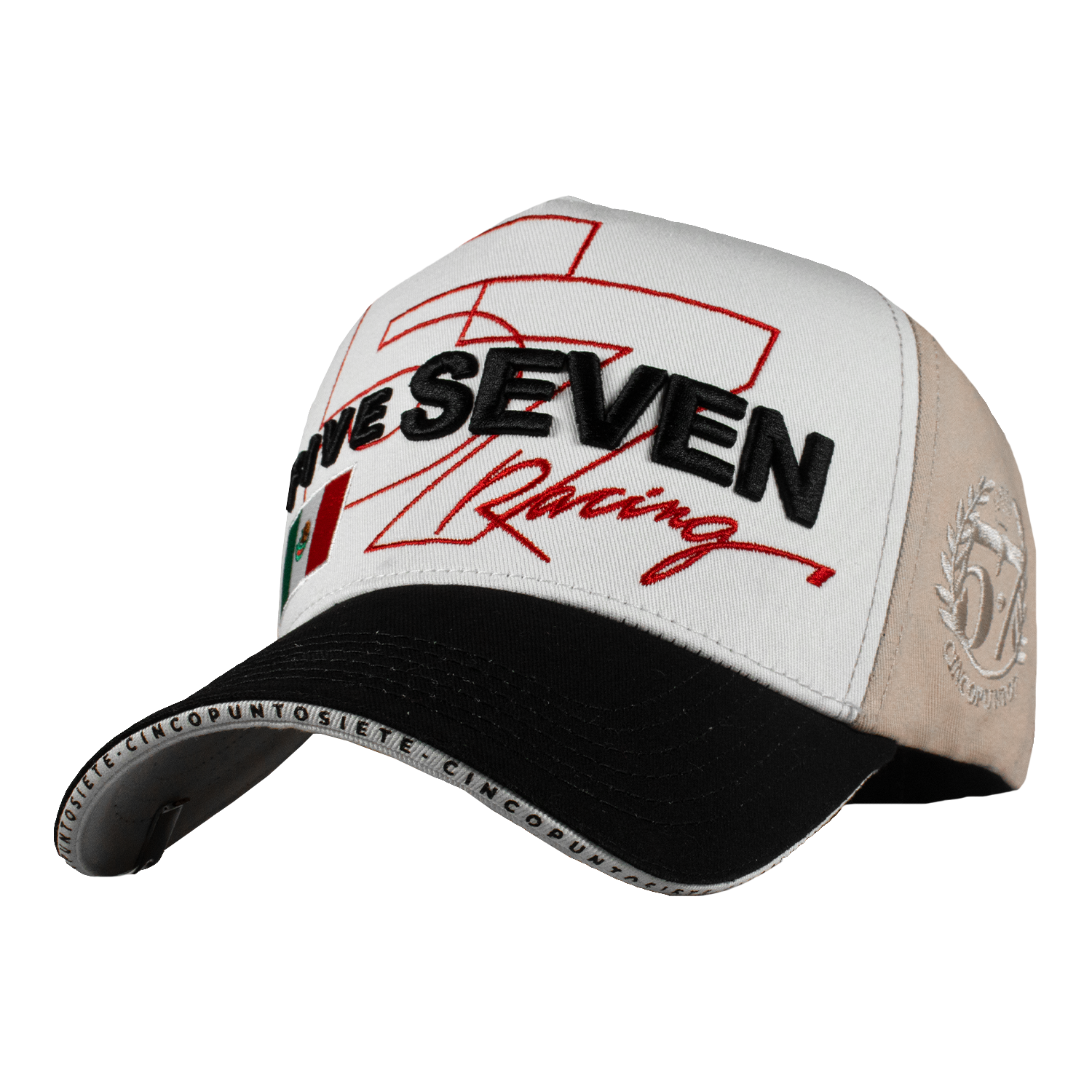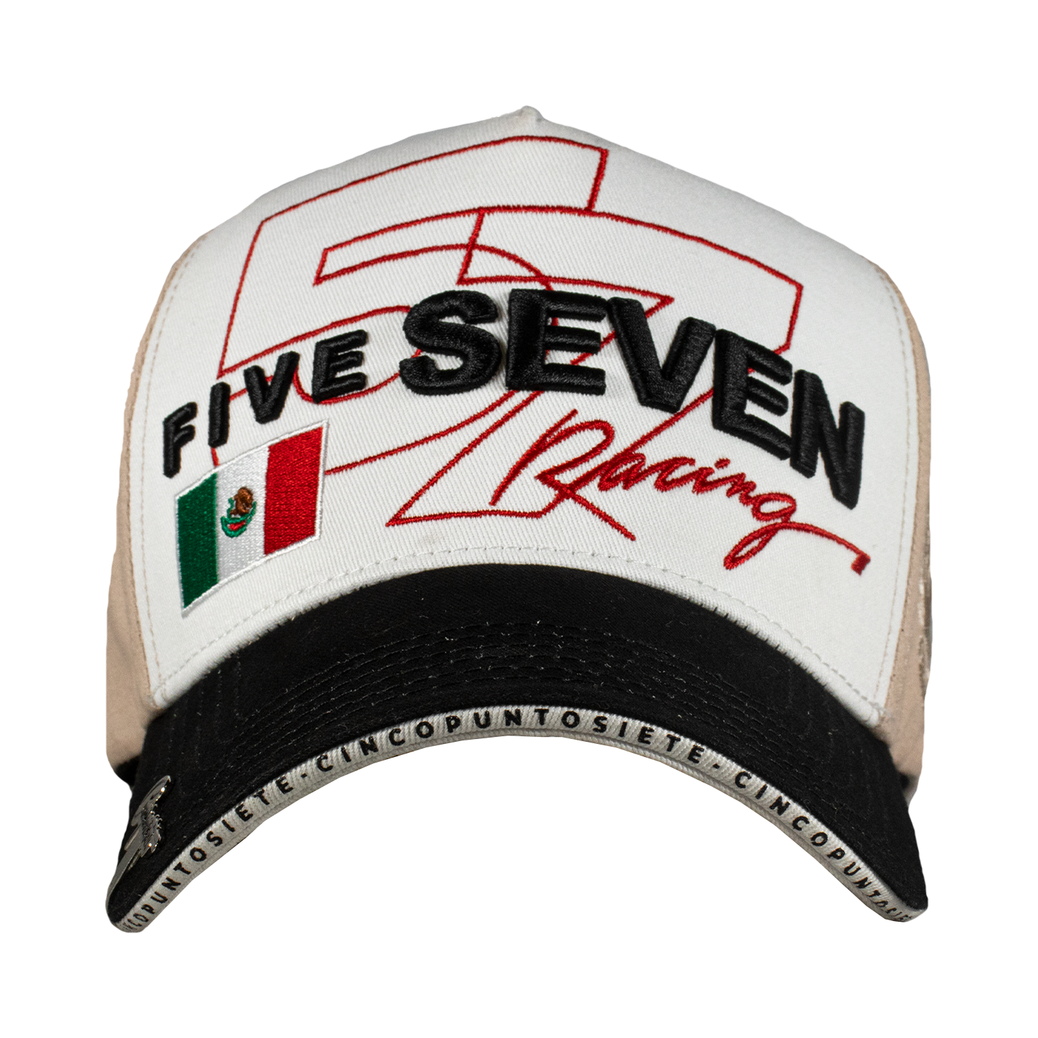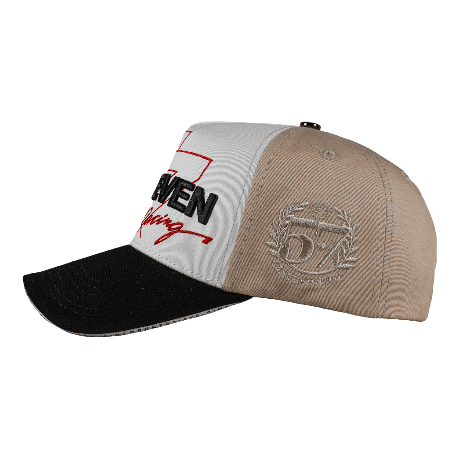 Es una gorra Curva, con tela de Gabardina y detalles de Racing en la parte Frontal, combinando el 3D y Bordado Plano, a un costado el Logo de la marca en color Beige, cuenta con un Pin en la visera, Boton Metalico y tambien con un Broche Personalizado, Entre la Visera y Bajovisera unas pequeñas letras con el nombre de la marca.
