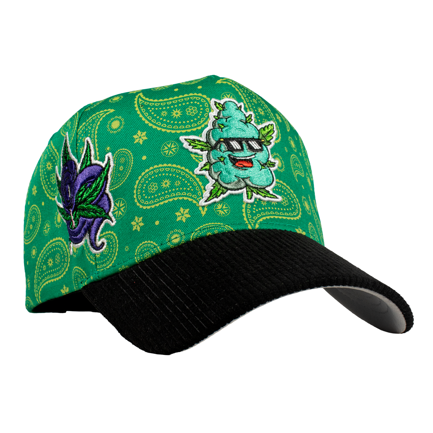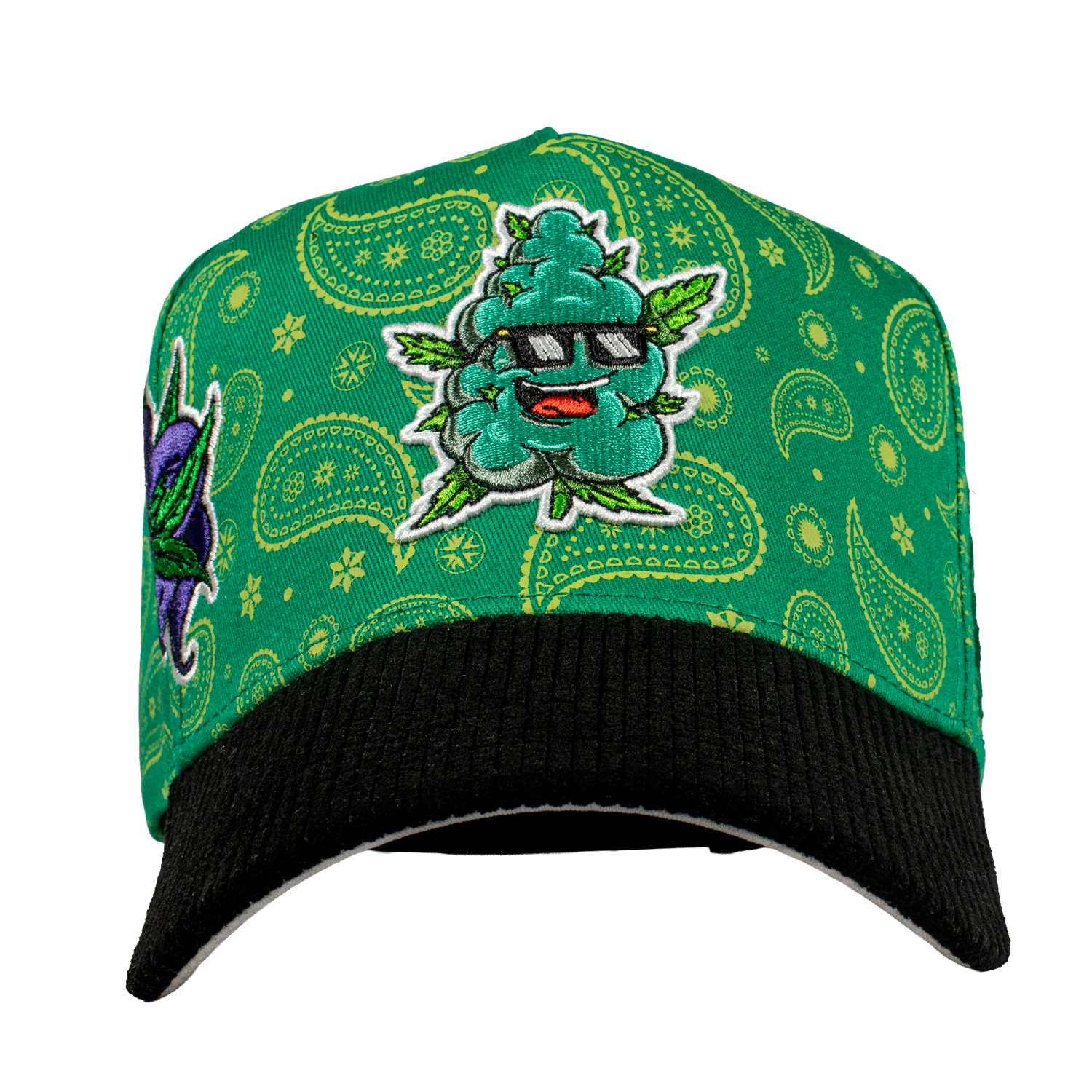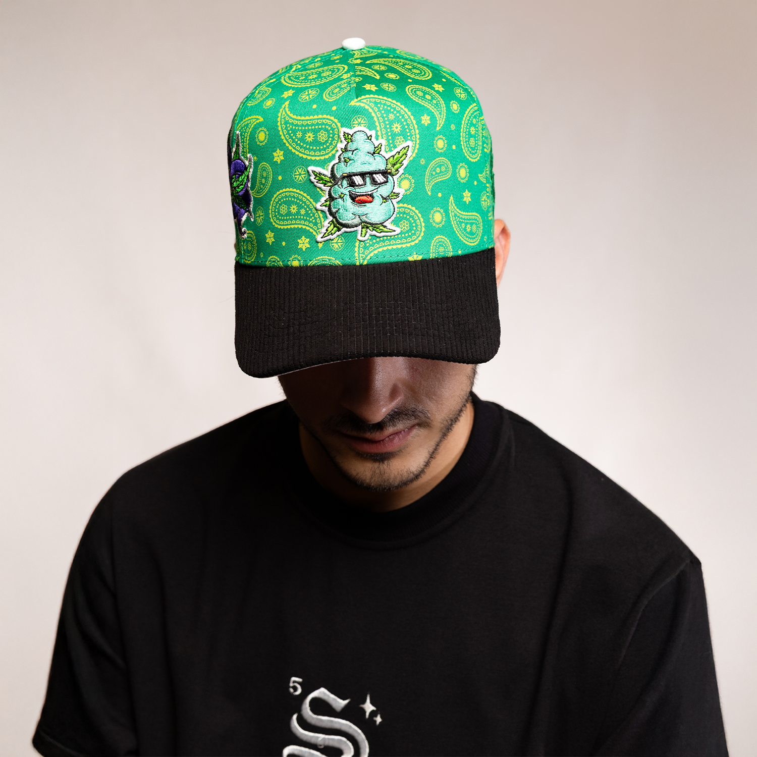 Es una Gorra de 5 paneles, con un Serigrafiado por la parte del Bonete  de color Verde Limon, Con un Bordado Frontal de una Planta, a un costado una Vibora de Color Mordado, por el otro lado el logotipo de la marca de color Verde, y un Broche Personalizado