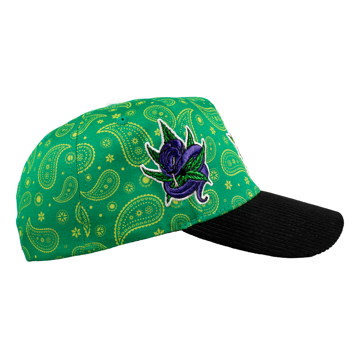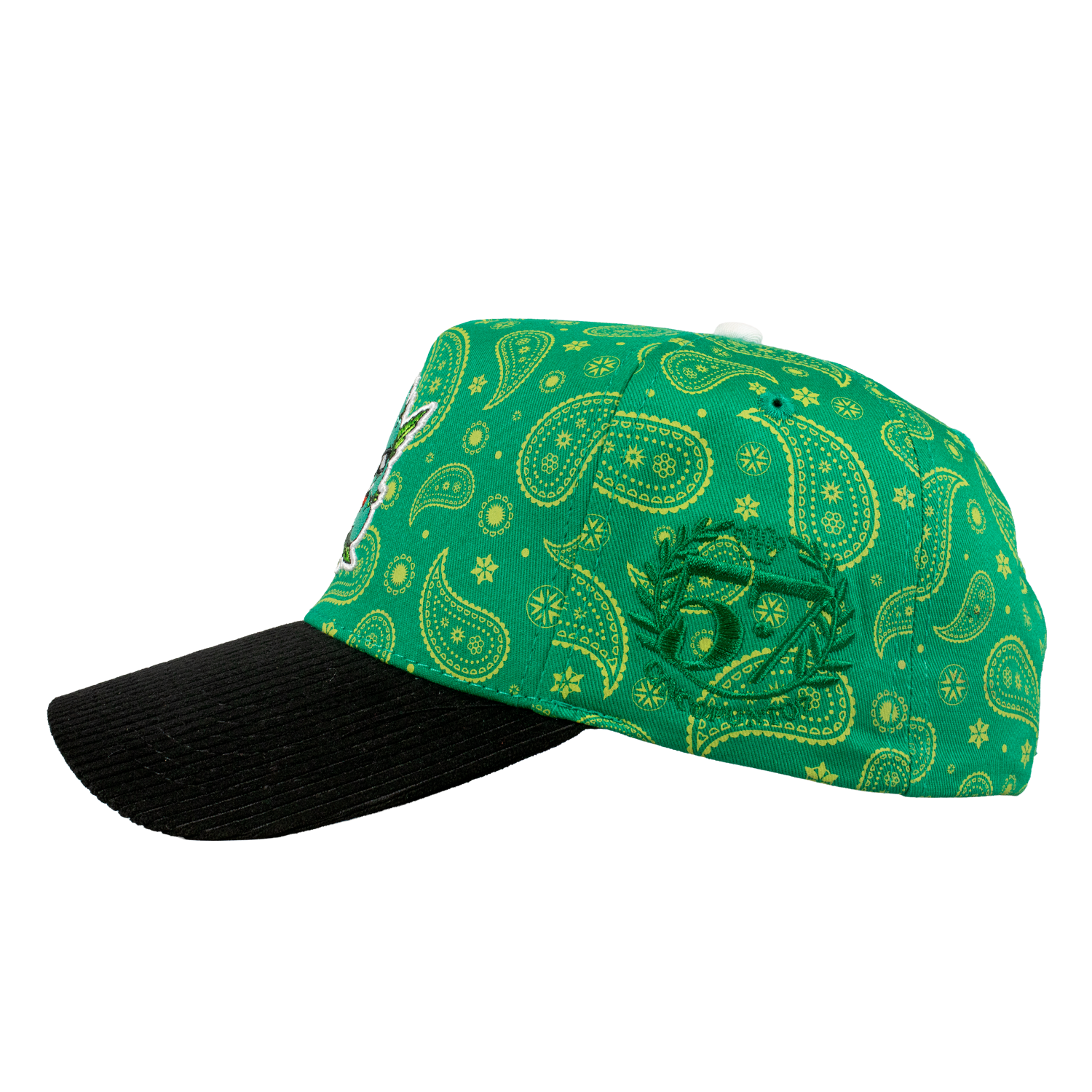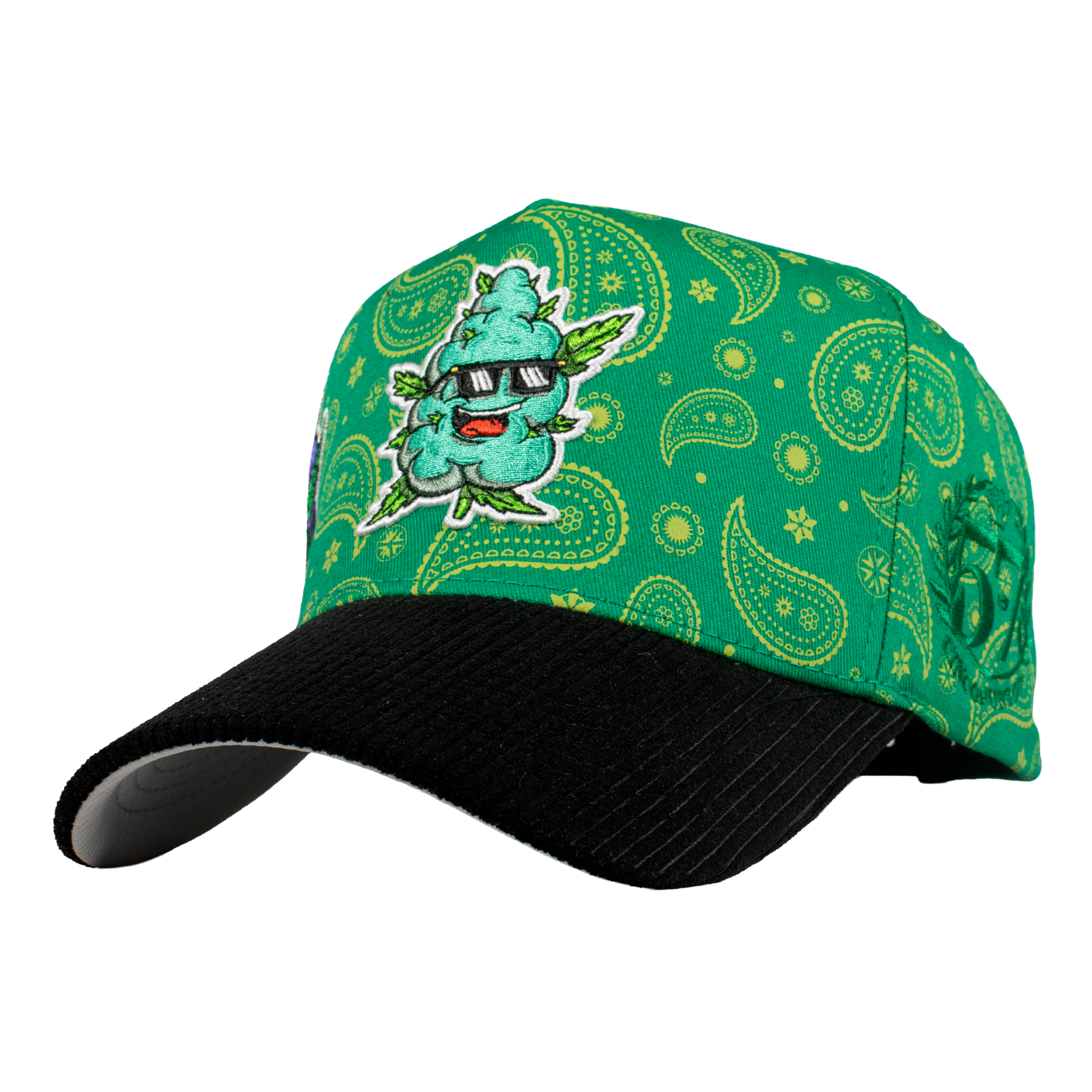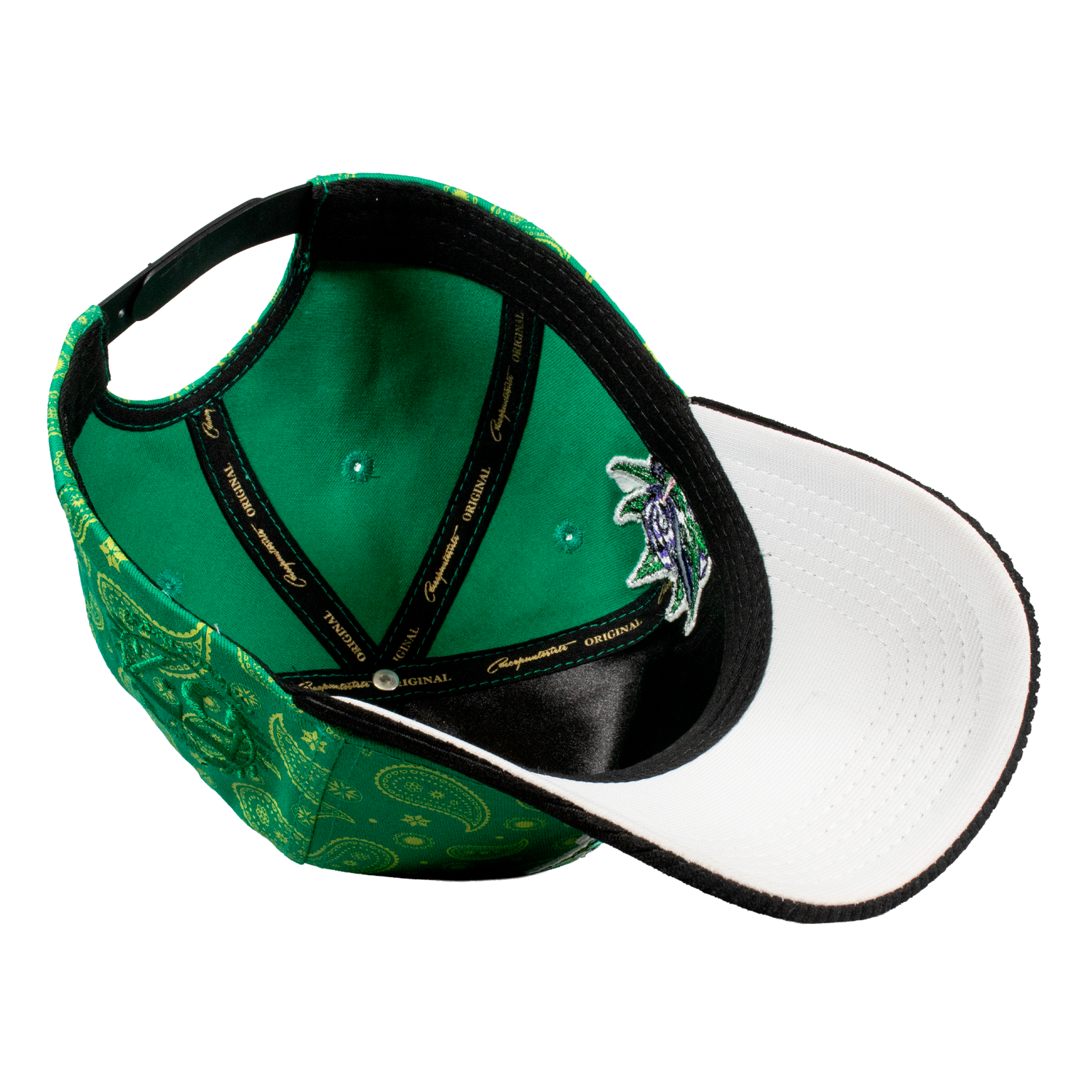 Es una Gorra de 5 paneles, con un Serigrafiado por la parte del Bonete  de color Verde Limon, Con un Bordado Frontal de una Planta, a un costado una Vibora de Color Mordado, por el otro lado el logotipo de la marca de color Verde, y un Broche Personalizado