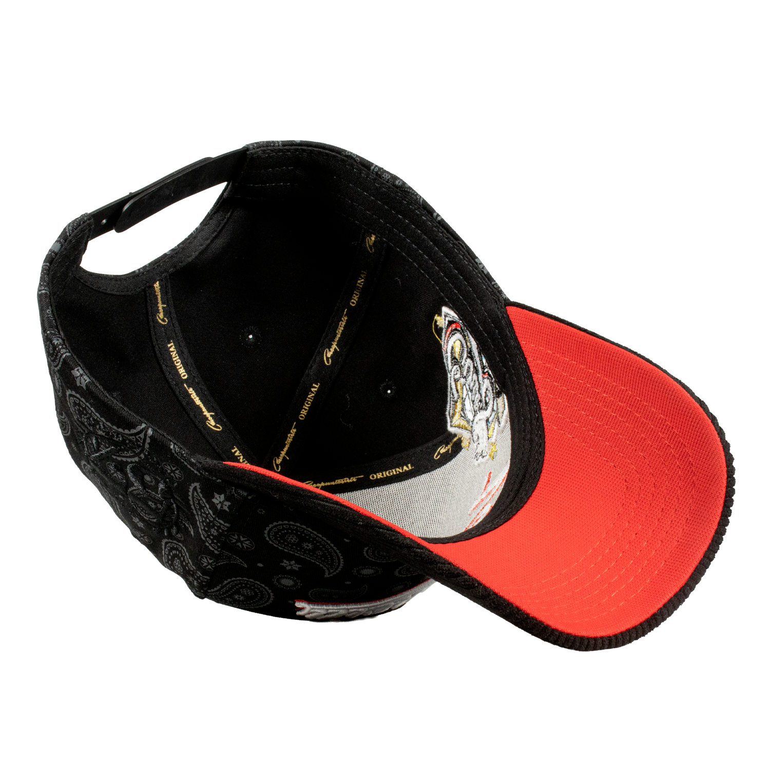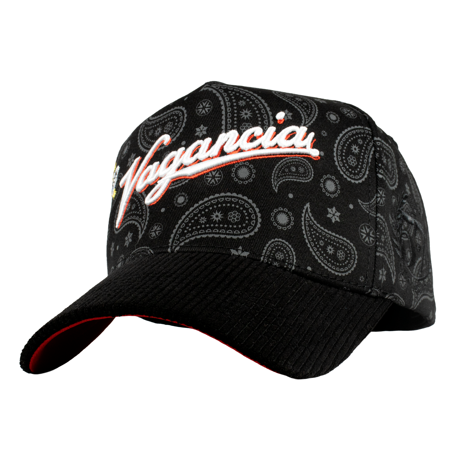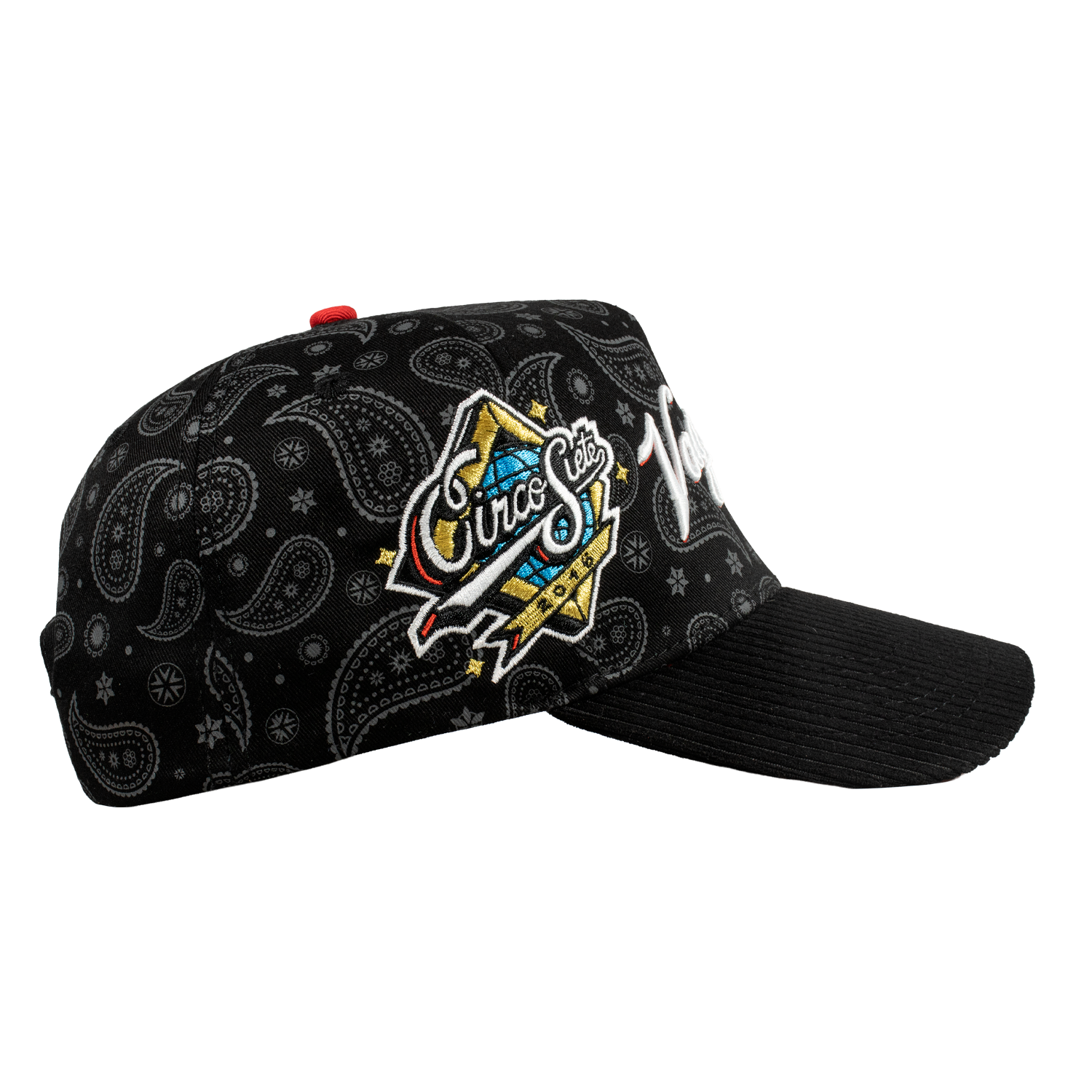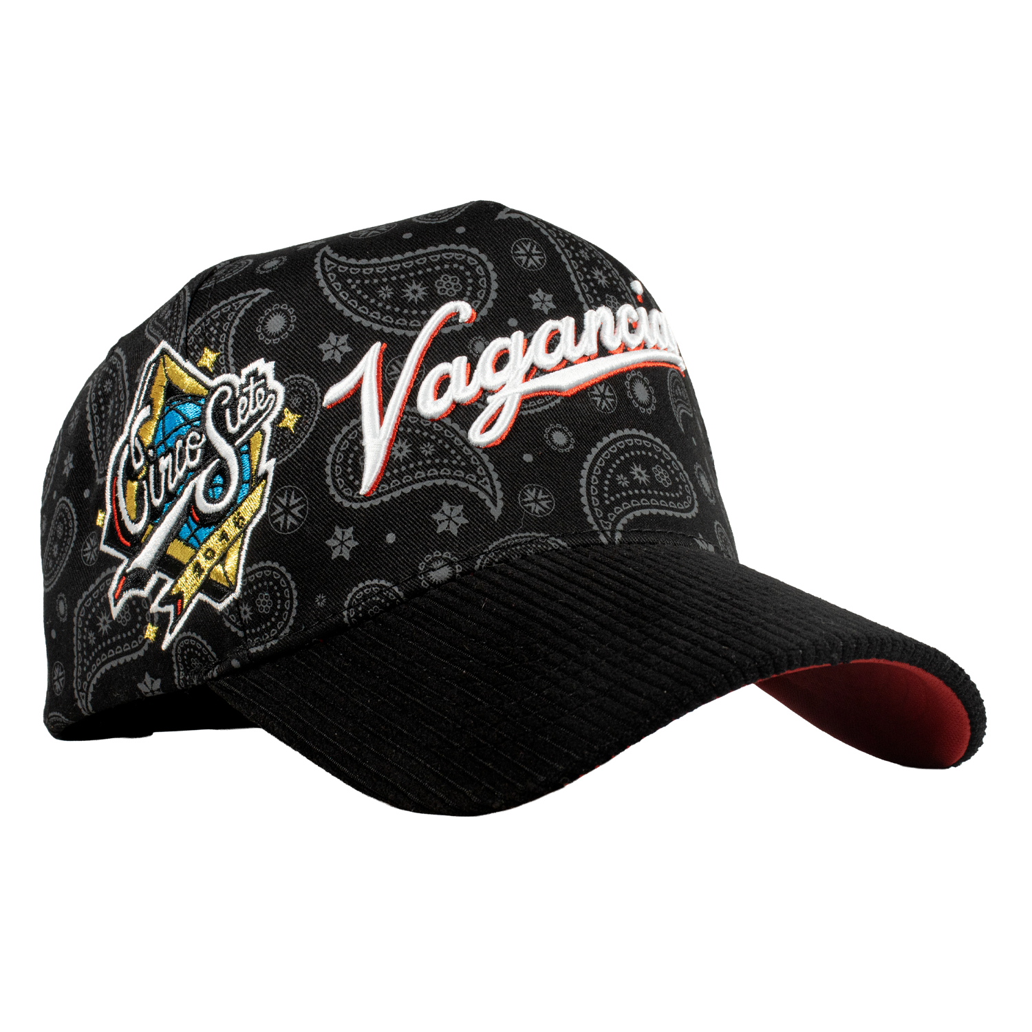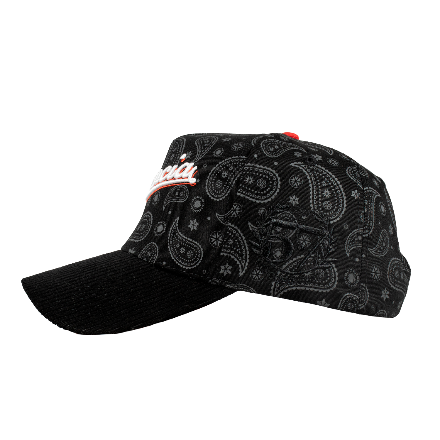 Es una Gorra de 5 paneles, con un Serigrafiado por la parte del Bonete  de color Negro, Bordado Frontal, por un costado un Bordado tipo World Series, por el otro costado el Logotipo de la Marca en color Negro en la Parte de la Visera tiene tela Tipo Pana, y un Broche Personalizado.
