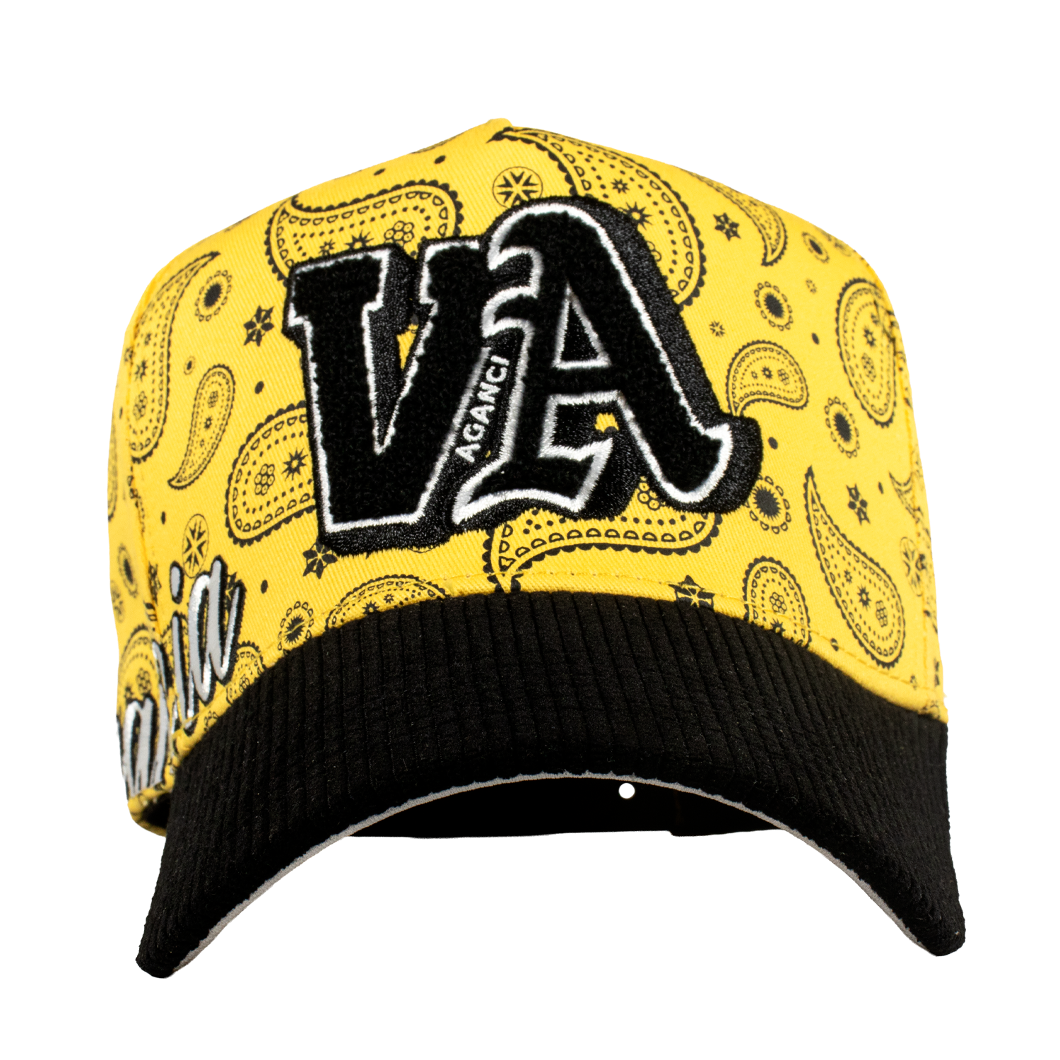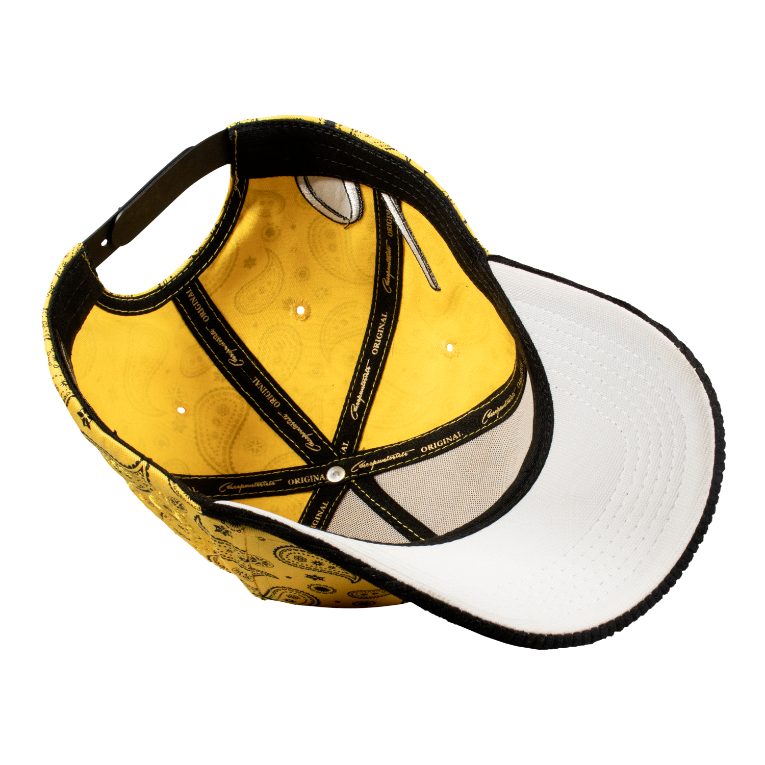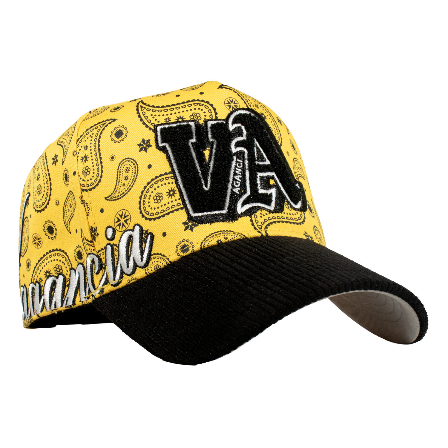 Es una Gorra de 5 paneles, con un Serigrafiado por la parte del Bonete  de color Amarillo, un Bordado Frontal Combinado con Chenille, Por la parte de lateral Derecho un Bordado que Abarca desde la parte de aun lado del broche hasta casi la parte frontal, del otro lado el logotipo de la marca color Amarillo, Tambien contando con un Broche Personalizado.