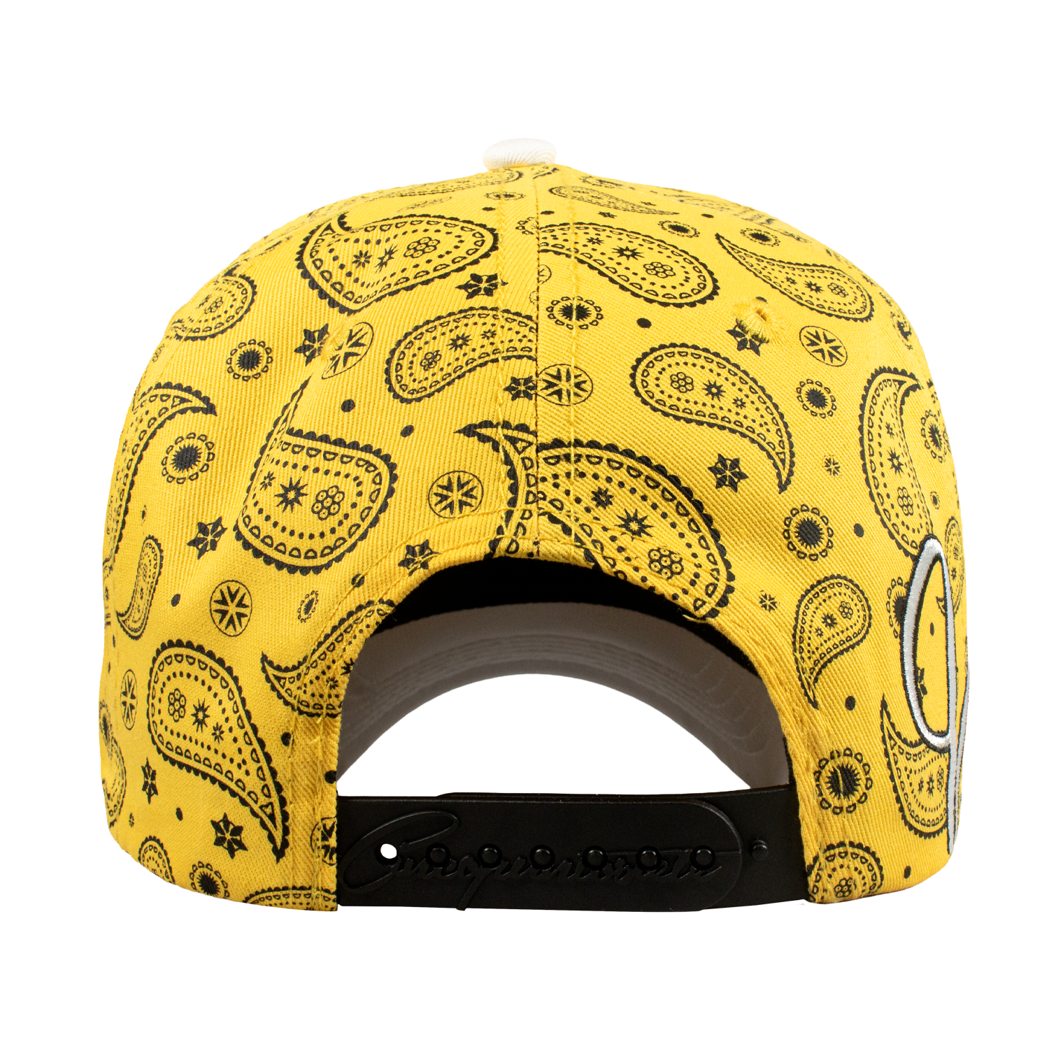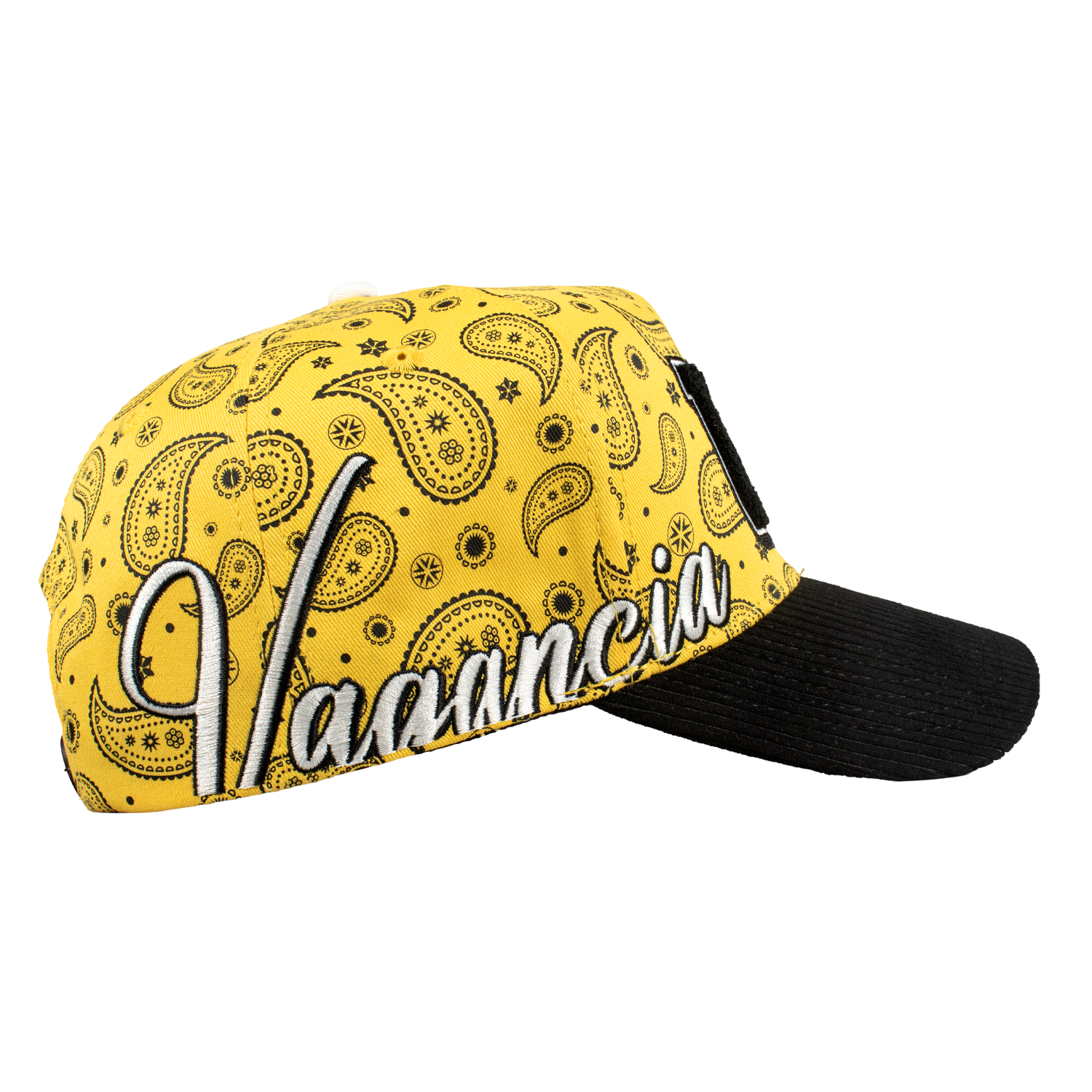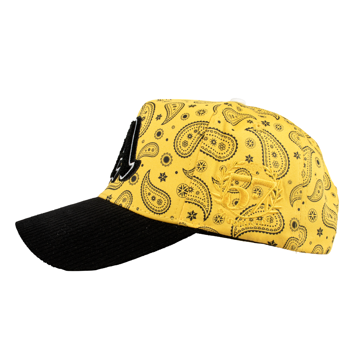 Es una Gorra de 5 paneles, con un Serigrafiado por la parte del Bonete  de color Amarillo, un Bordado Frontal Combinado con Chenille, Por la parte de lateral Derecho un Bordado que Abarca desde la parte de aun lado del broche hasta casi la parte frontal, del otro lado el logotipo de la marca color Amarillo, Tambien contando con un Broche Personalizado.